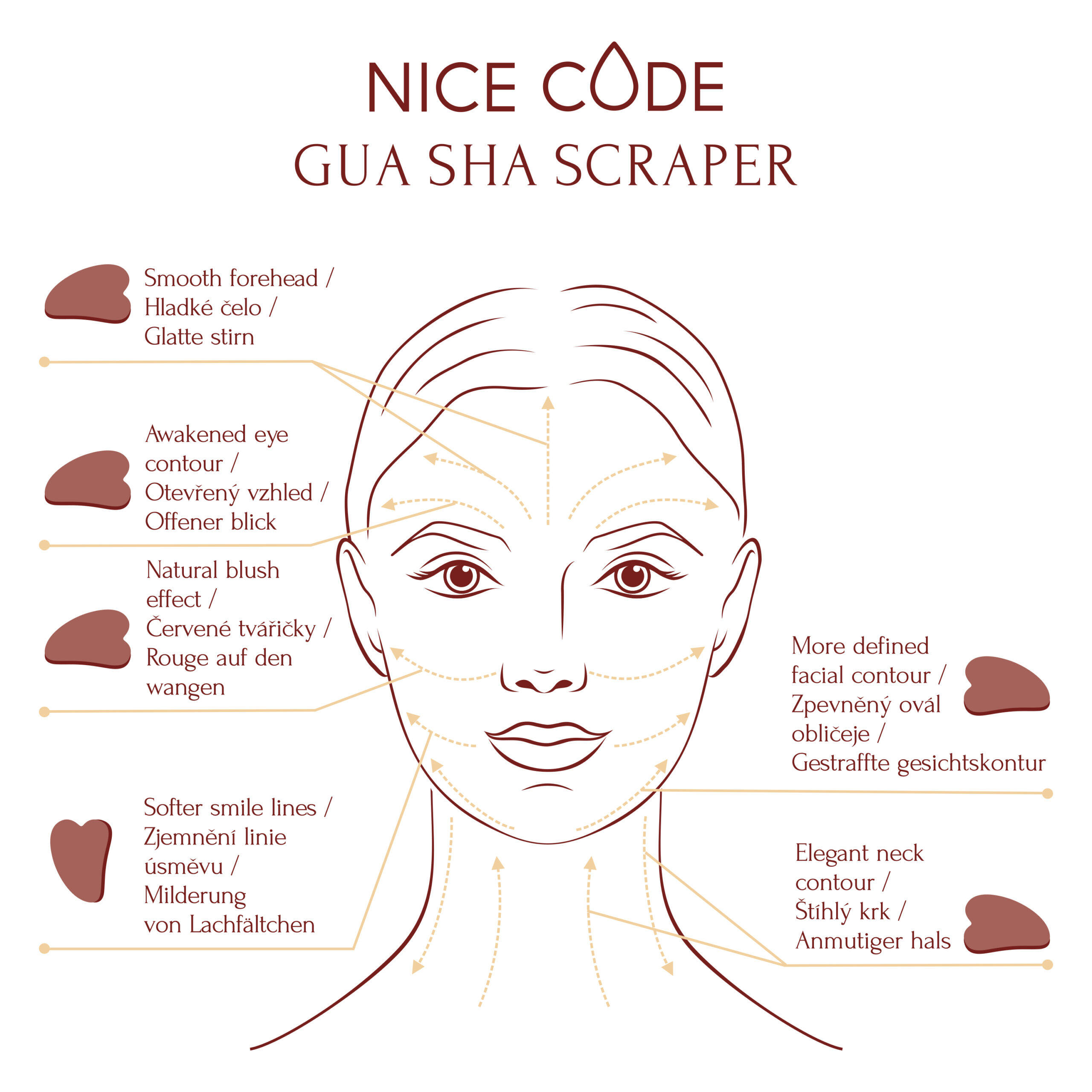 Pateicoties skrāpja dziļajai iedarbībai masāžas laikā, tiek sasniegti tādi efekti kā detoksikācija, liftinga efekts un limfodrenāža. Rezultātā tiek saglabāta sejas ādas jaunība un mirdzums. Guaša masāžas veikšanai iesakām izmantot skrāpi kopā ar Nice Code sejas masāžas serumu kas nodrošina ideālu slīdēšanu.